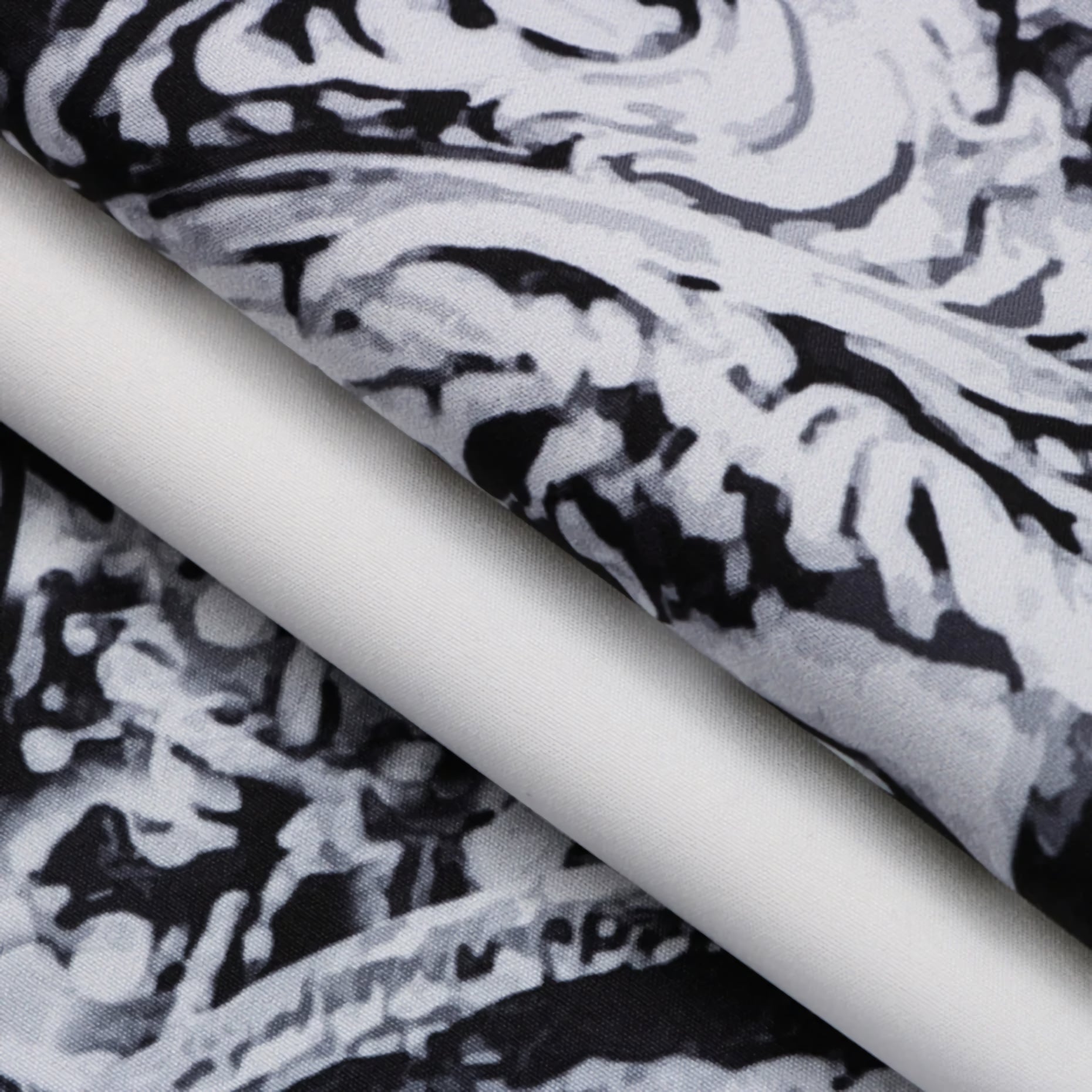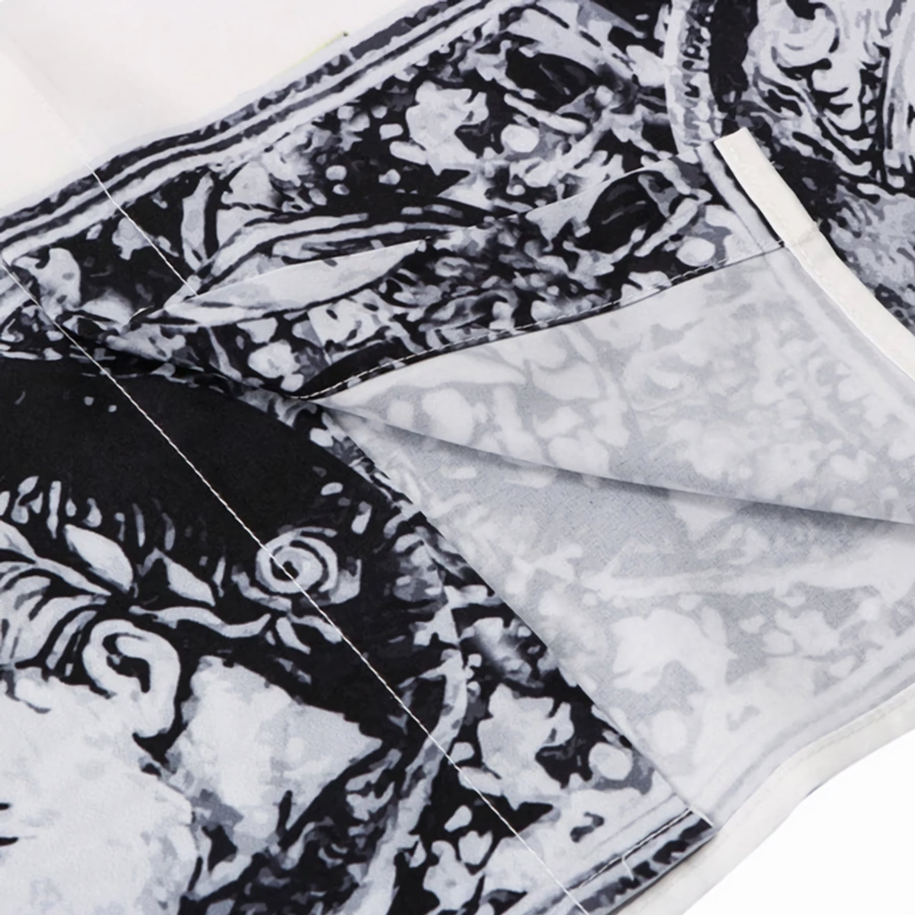 The fabric drapes softly and provides breathable comfort. The ancient coin-inspired print adds a timeless visual depth.