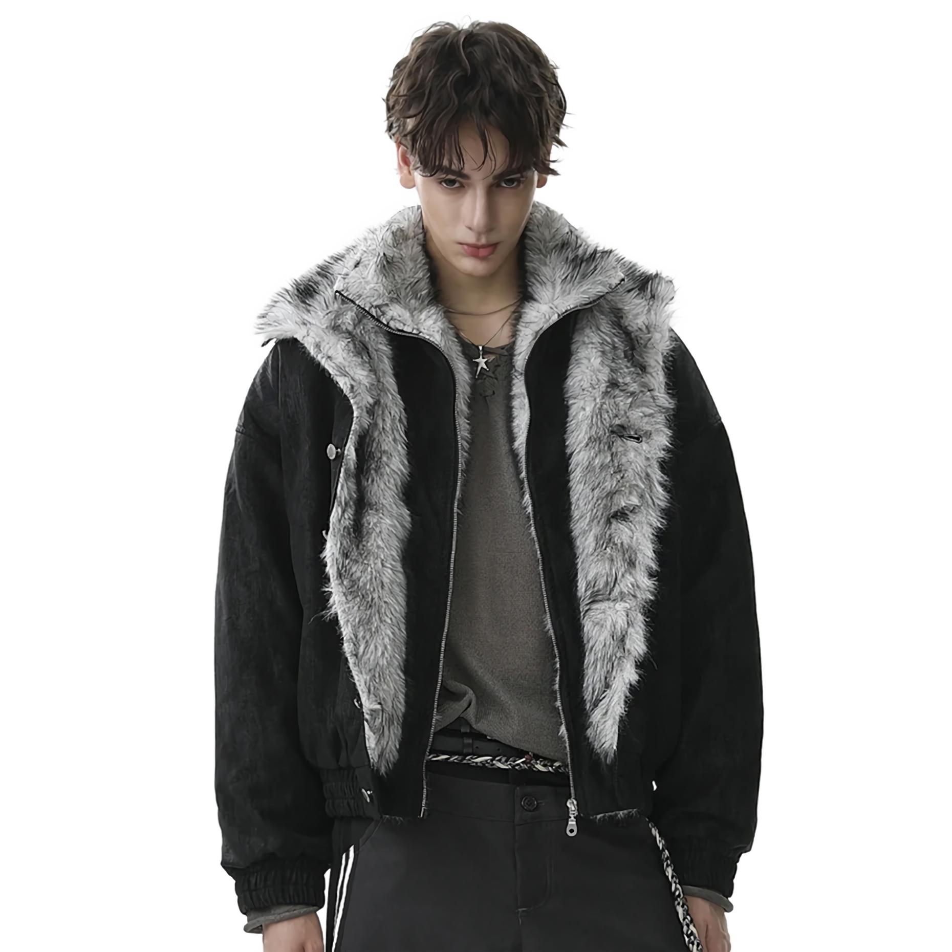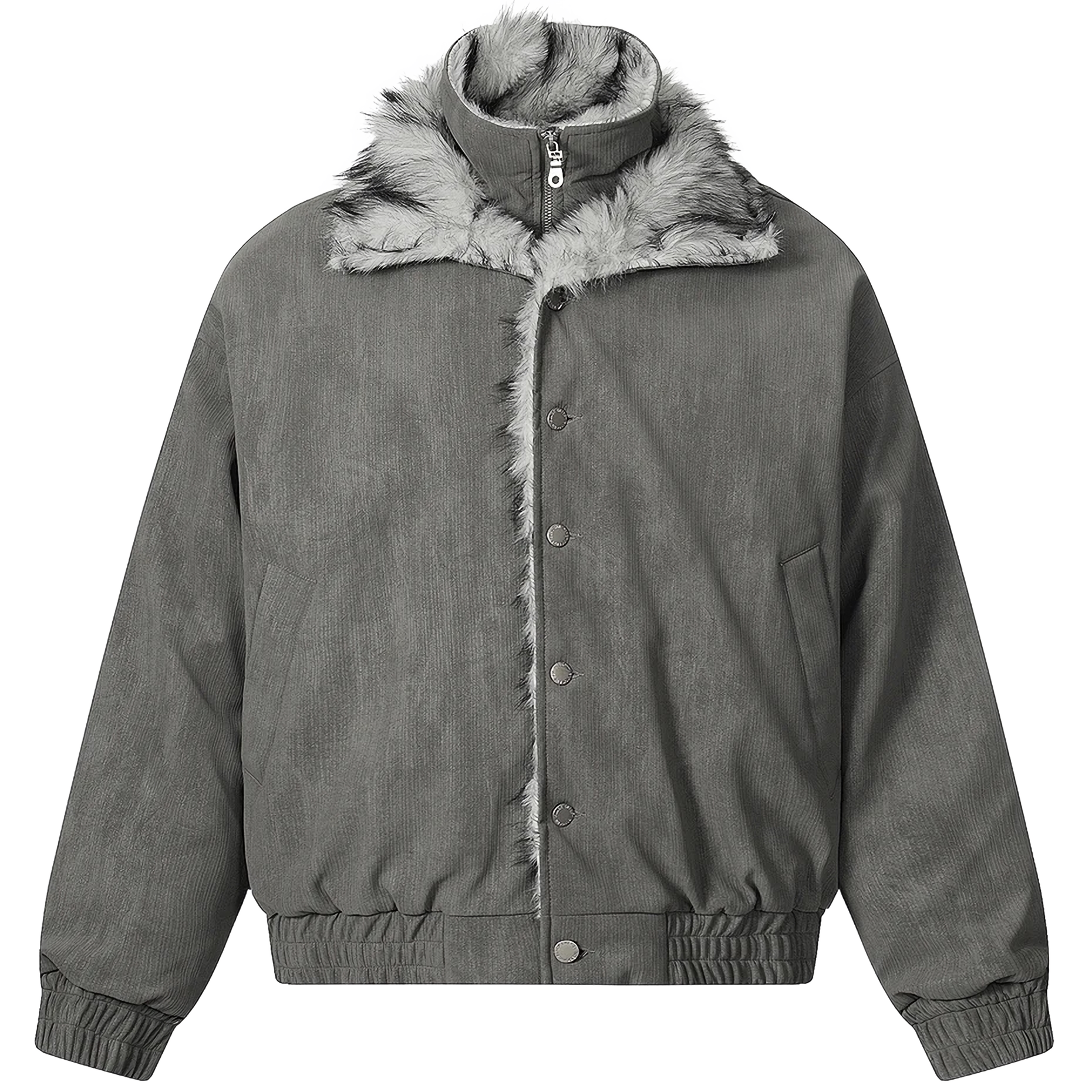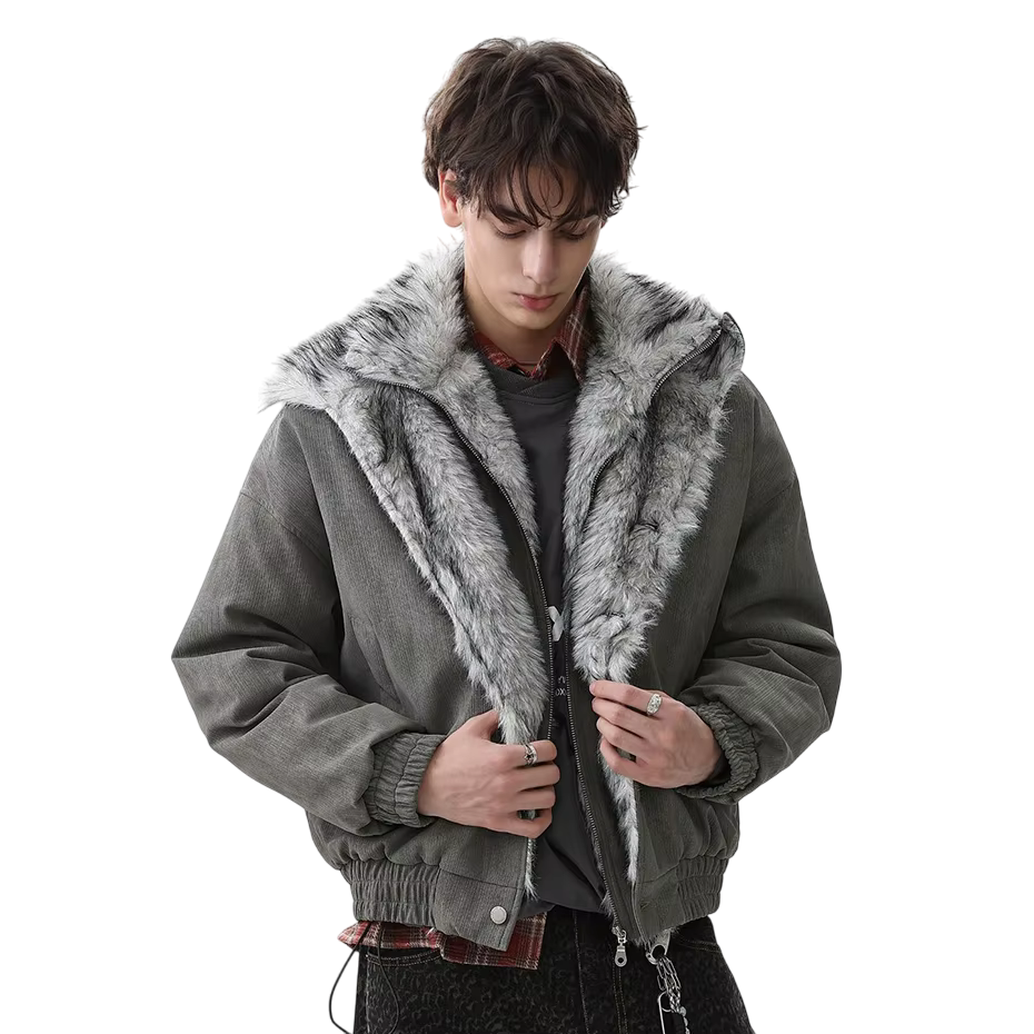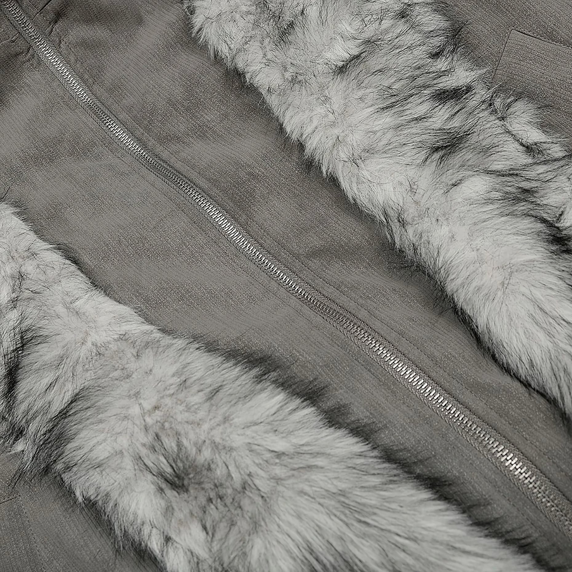 - Luxuriant gray faux-fur trim