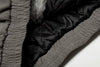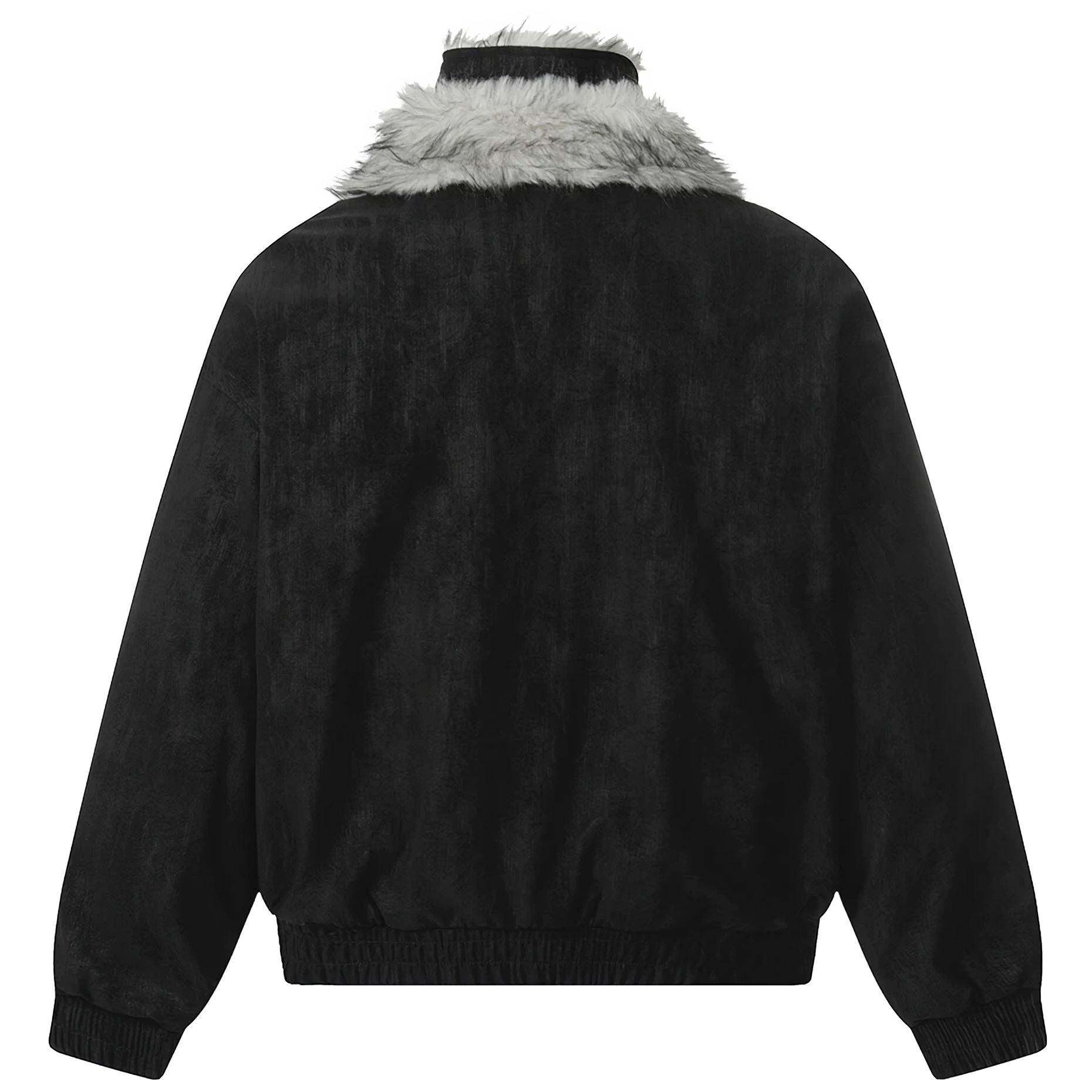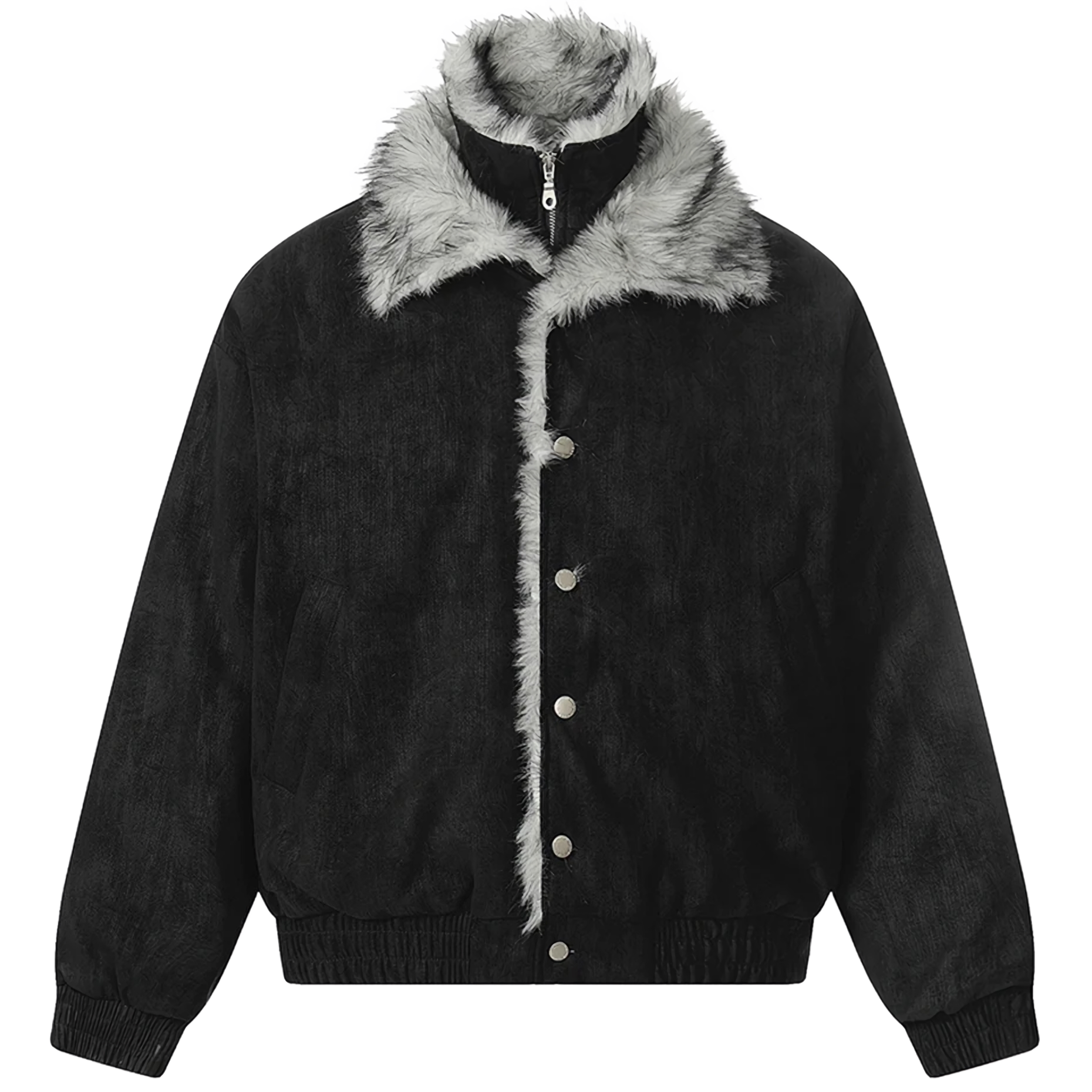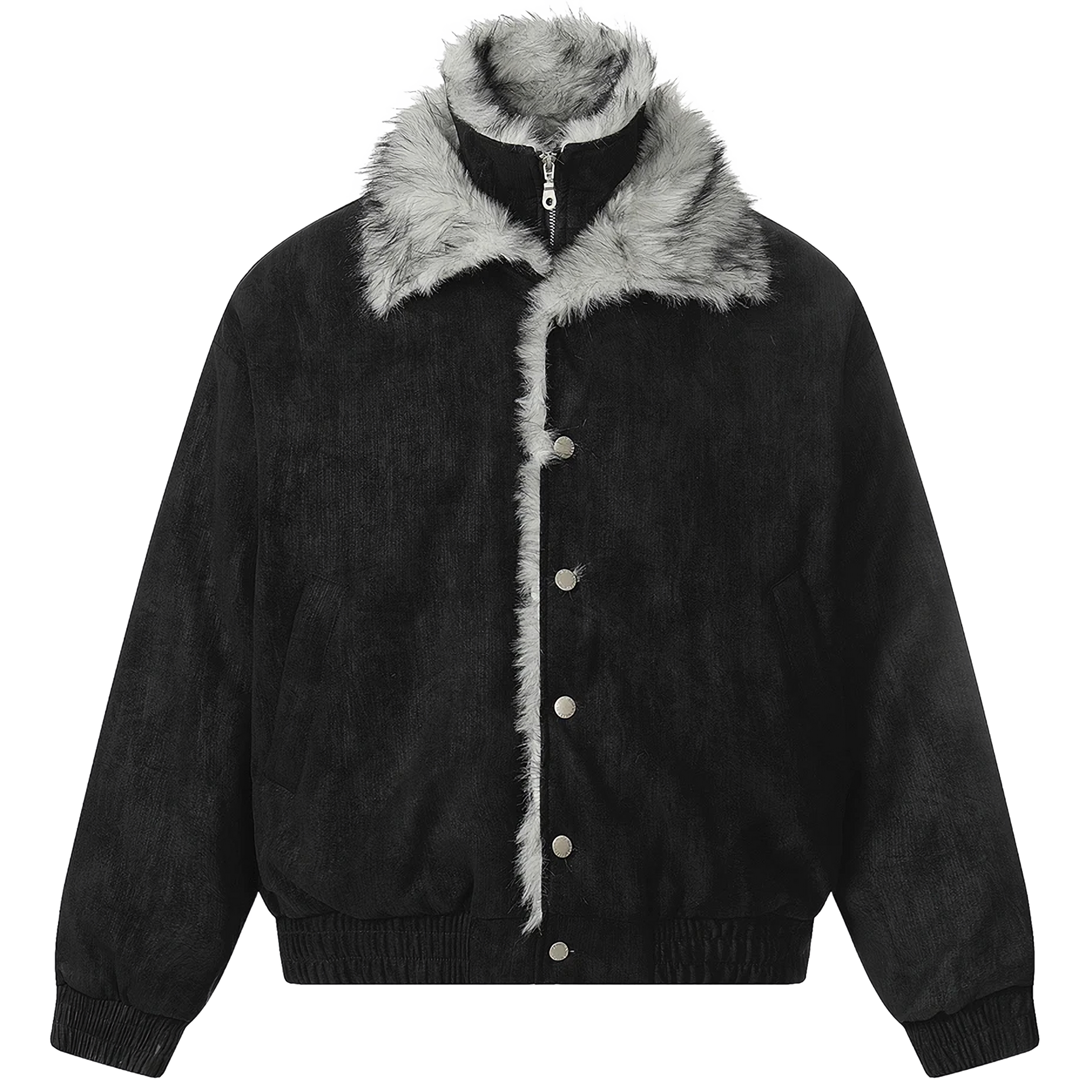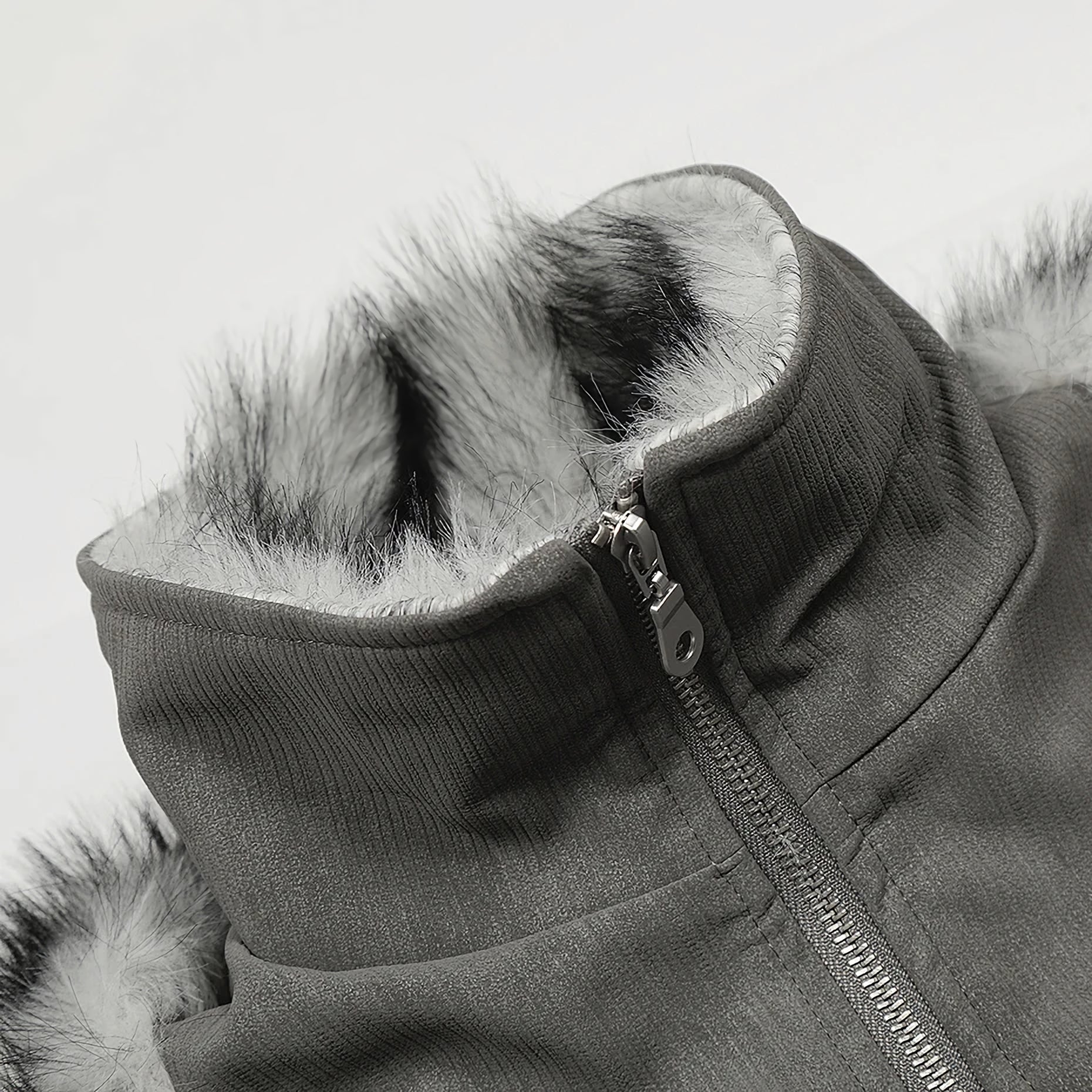 - Luxuriant gray faux-fur trim