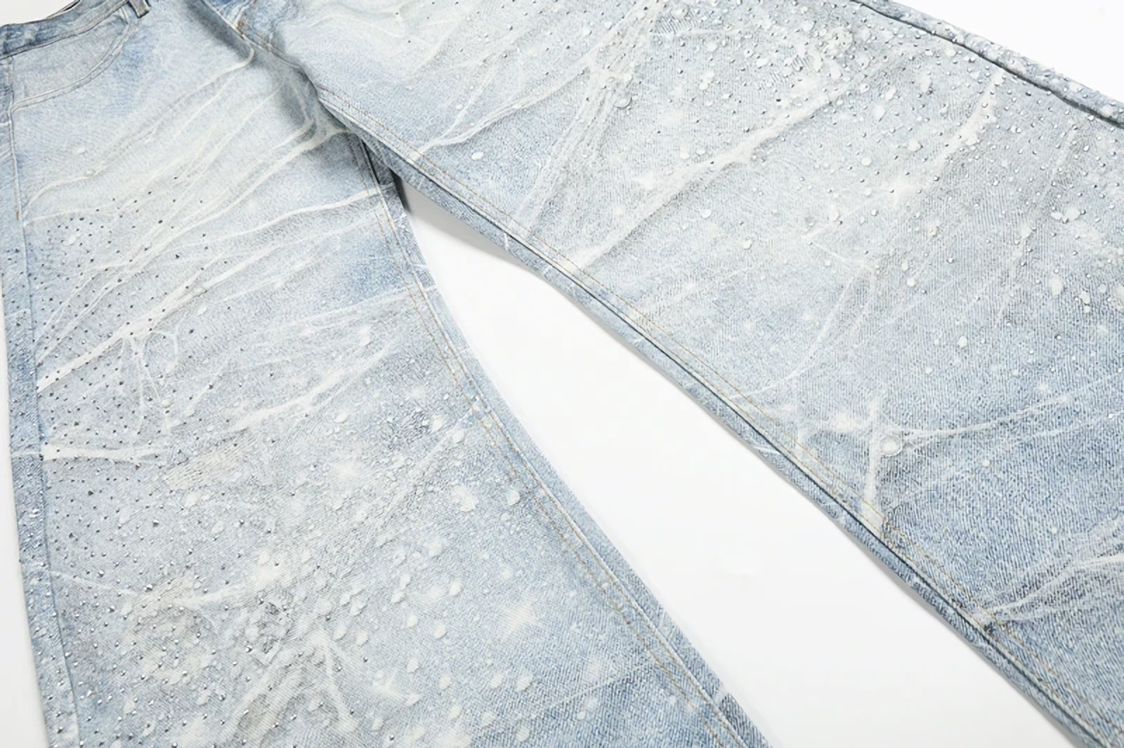 Turn jeans inside out and machine wash in cold water. Line dry to preserve the rhinestone studs.